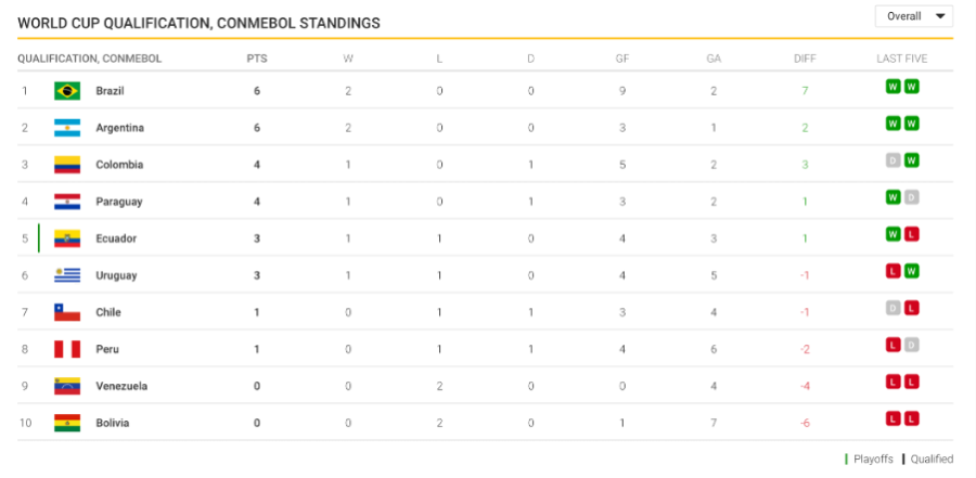 South America World Cup Qualifiers 2022 Table: Standings after
